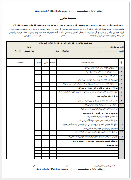 چک لیست مشاهده ی رفتار دانش آموز در خارج از مدرسه(مخصوص اولیاء)