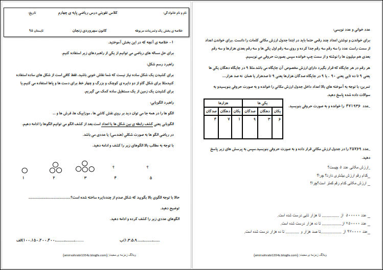 امحتان ریاضی بخش الگوها و عدد نویسی