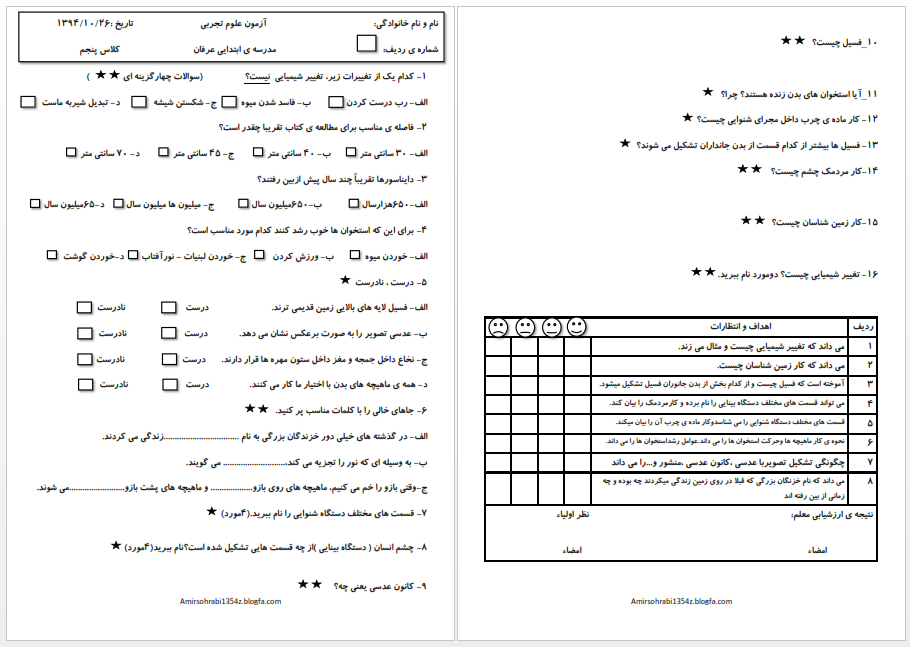 آزمون نوبت اول علوم تجربی کلاس پنجم همراه چک لیست ،امروز 26 دی